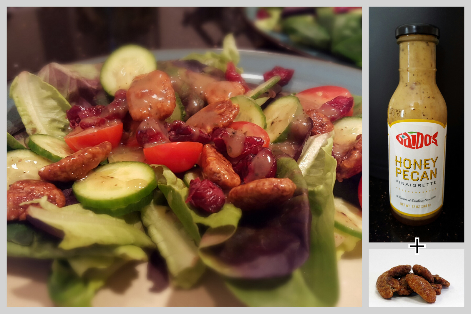 Many of our customers buy our Honey Toasted Pecans to toss on salads.  Well, we do too, and we discovered the perfect dressing to bring out the perfect flavors.  Gaido's Honey Pecan Vinaigrette is a must for this salad. We added crunchy baby cucumbers, grape tomatoes, red and green butter lettuce and tangy dried cranberries.