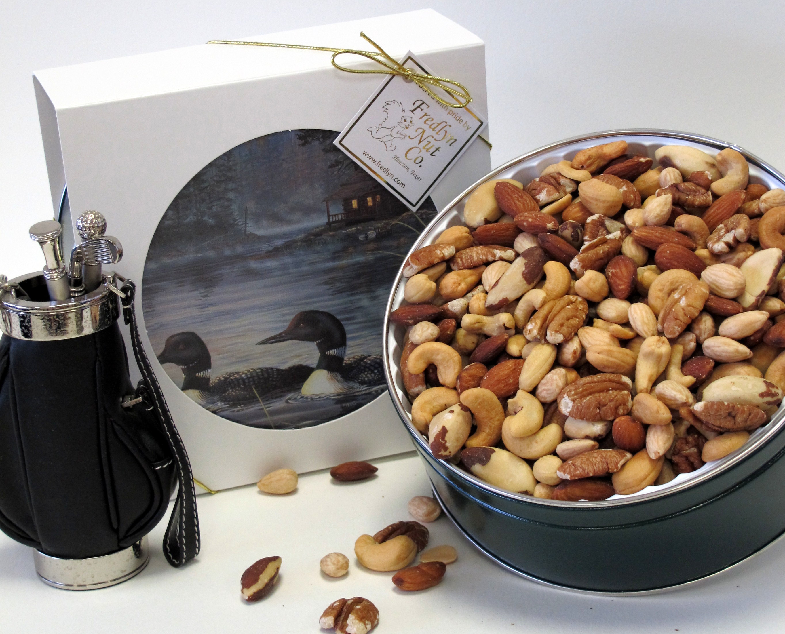 We proudly present our fancy Deluxe Mixed Nuts in a decorative tin (our popular 2 lb. size is shown in photo). This traditional gift is sure to bring a smile. A blend of Cashews, Natural and Blanched Almonds, Brazil Nuts and Texas Pecans, freshly roasted, lightly salted, and packed in our kitchens. Each tin is wrapped with a sleeve and gold stretch cord. Fill out an enclosure card (option during checkout) and we'll include it with the gift. Ship to multiple addresses!