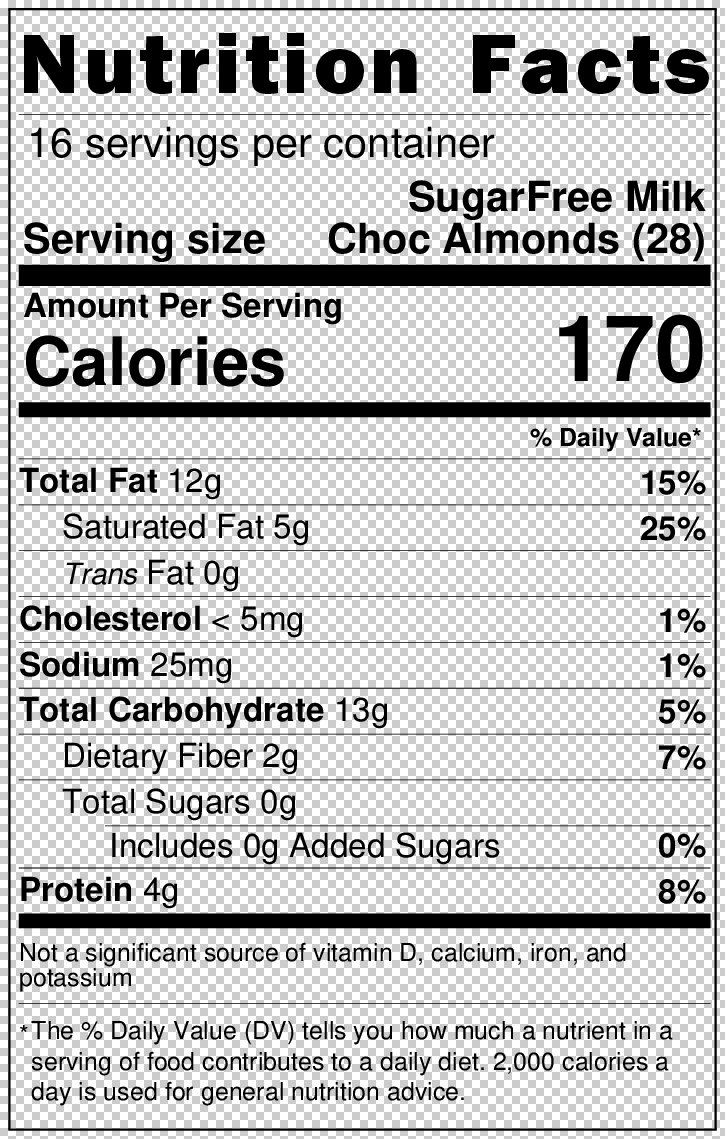 Delicious Sugar Free Milk Chocolate Almonds, great to snack on for someone who is watching their sugar intake. Our Sugar Free Chocolate Almonds are made with only the finest grades of almonds and milk chocolate. Contains (maltitol, cocoa butter, chocolate liquor, sodium caseinate (milk), anhydrous milk fat, soy lecithin, vanillin), almonds, gum arabic, & certified confectioners glaze.